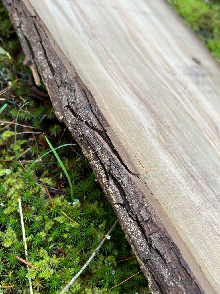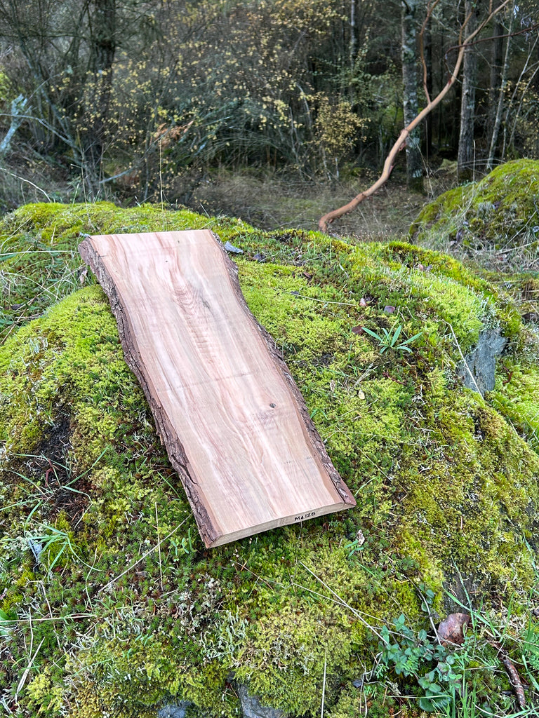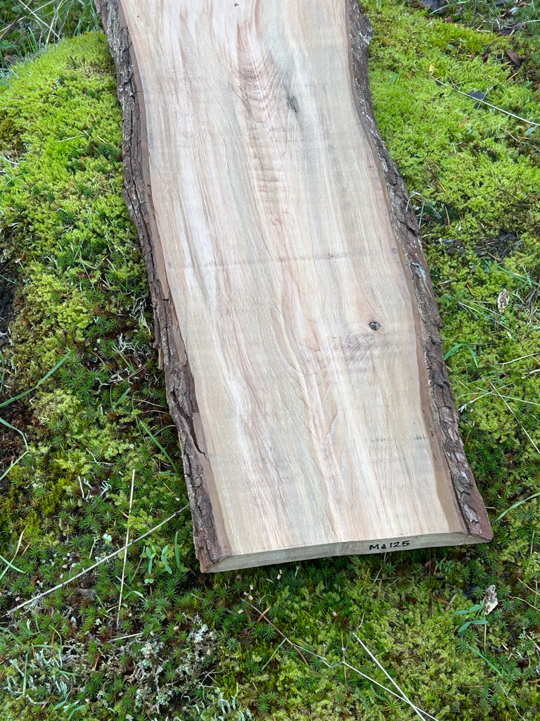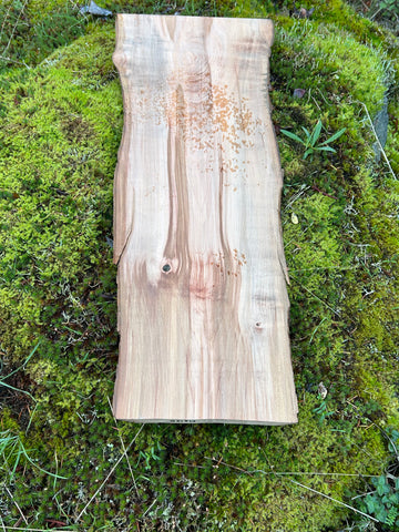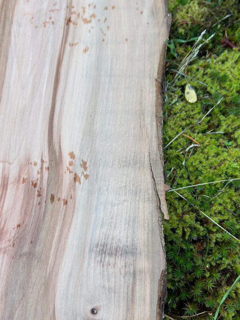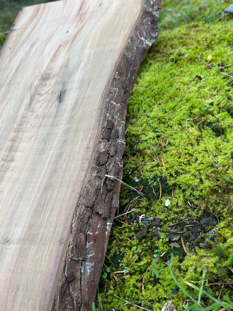 The board's width ranges from 8.5" to almost 11", averaging about 9.5". It has been surfaced on top and bottom. There are surfaces blemishes from the milling/planing process that will sand off readily -- we usually start at 80 grit. It has been carefully air-dried to a stable 10–12% moisture content, making it well-suited for indoor woodworking. There are a few small knots in the board. There are several open cracks near the bark/cambium interface. You may wish to leave open or to fill with epoxy. Note -- the water splotches in some of the photos are dew from the moss, not a defect in the board.