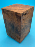 Mesquite Block M-1107 2.8" x 2.7" x 4.4" 1.1 lbs. This is a beautiful end-grain block of Texas-grown Honey Mesquite. The color is the rich, reddish-brown of Mesquite heartwood. It is moderately burly and has eye-catching chatoyance. This block has been fully air-dried to 10-12% moisture content. The grain appears to be curving and complex throughout. This block has plenty of character. There is an open void in the block that appear to be a during-growth opening, rather than drying cracks. You may wish to use epoxy or CA glue to fill this prior to turning. This is an awesome block, probably best for very sharp tools and an experienced hand. |